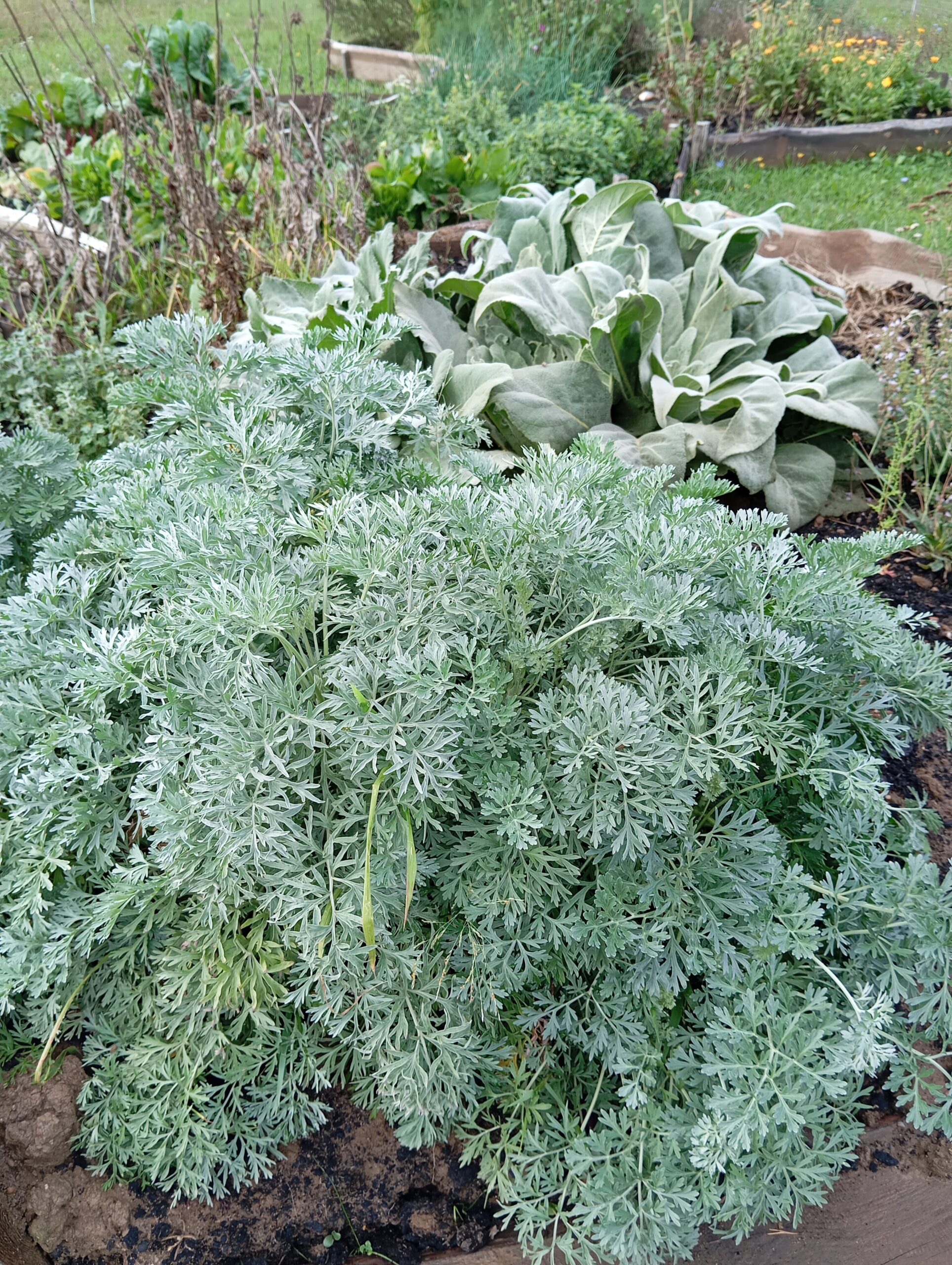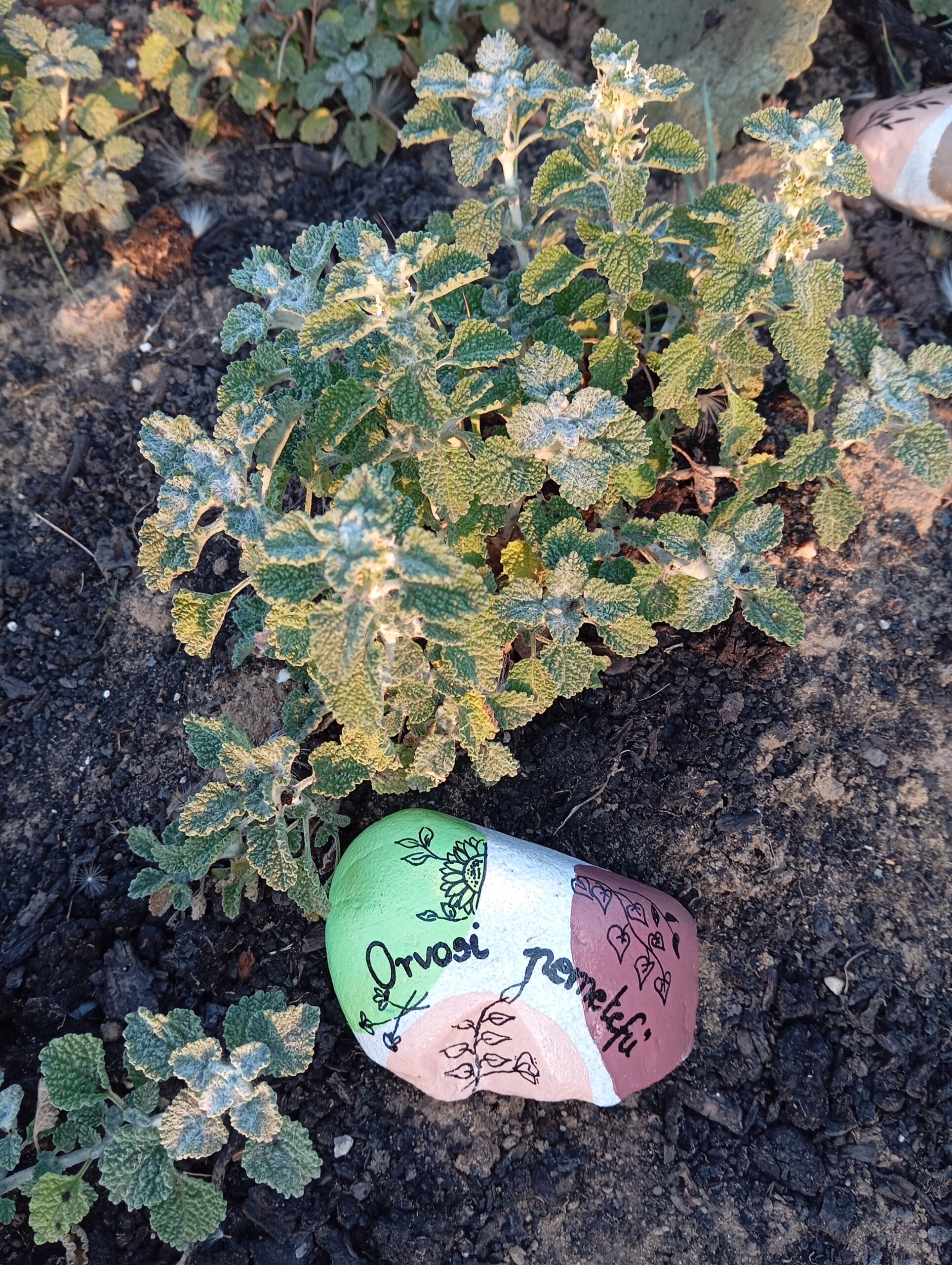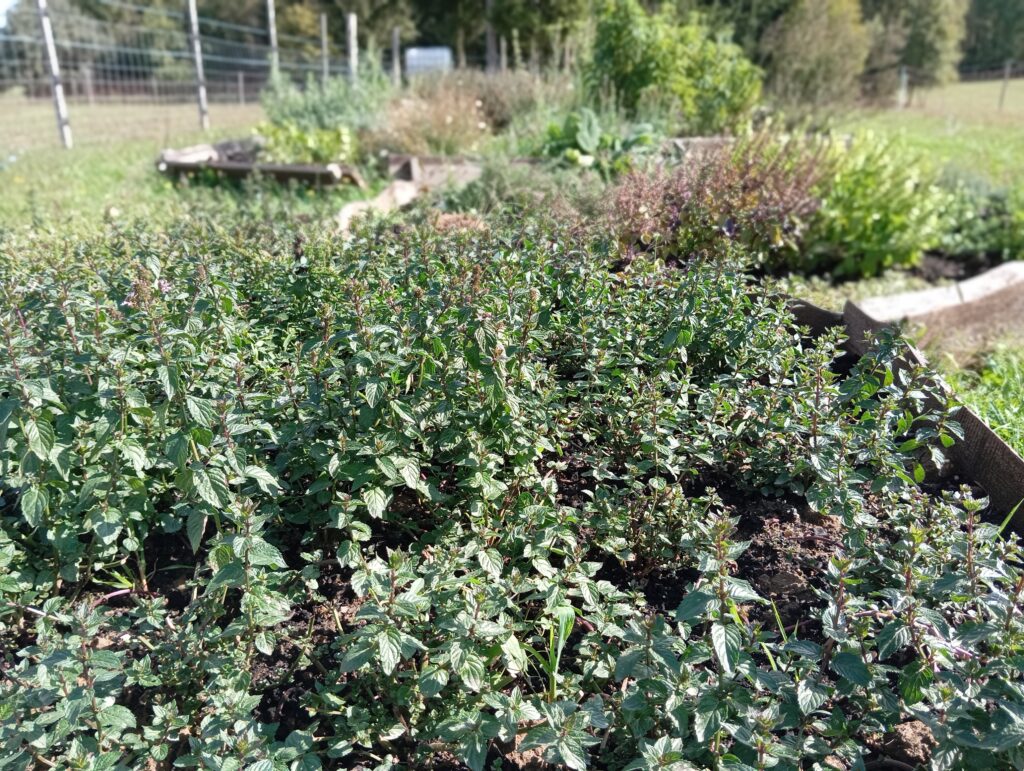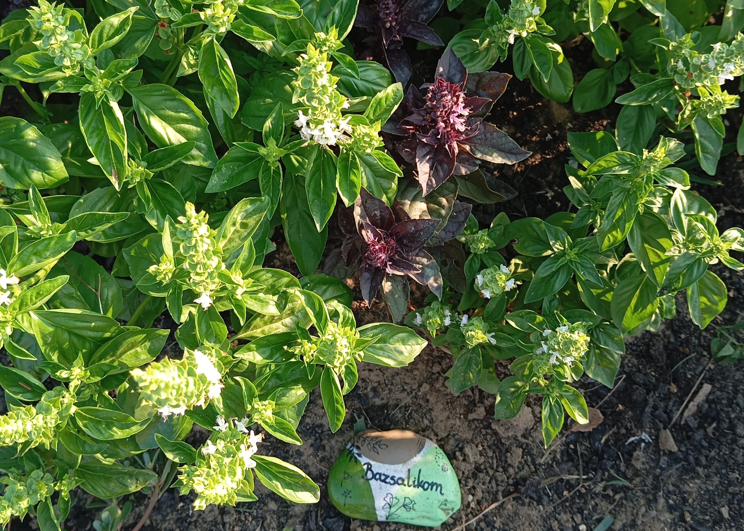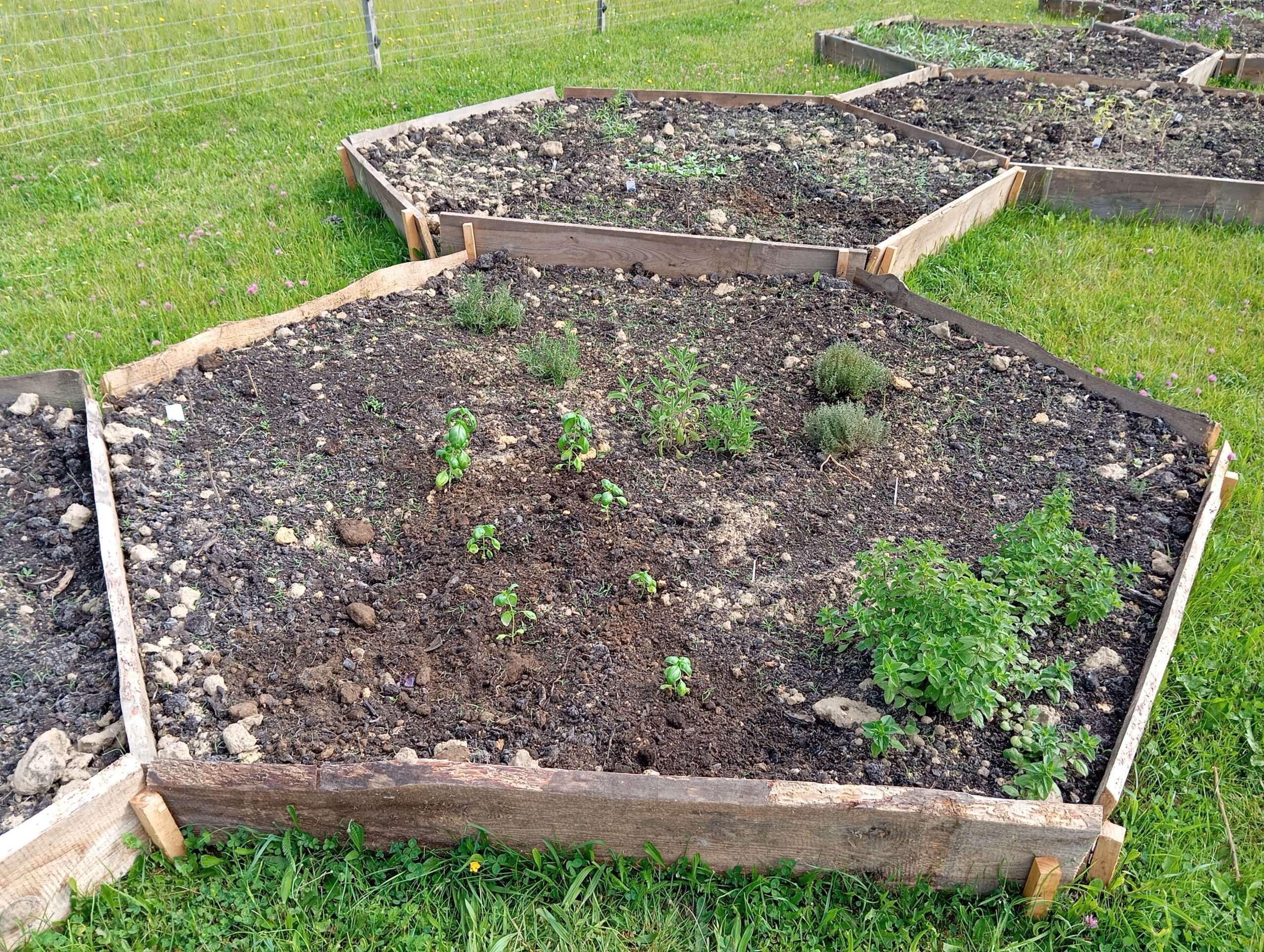 És mi került az ágyásokba? Igyekeztem tematikusan elrendezni a növényeket. Így lett egy menta ágyás, ahol többféle mentával lehet megismerkedni, megillatolni, esetleg megízlelni. Lett egy mediterrán gyógy- és fűszernövényeket felvonultató ágyás, melyben helyet kapott a kakukkfű, a bazsalikom, az orvosi zsálya és a muskotályzsálya, a rozmaring, a koriander, és természetesen az oregánó, vagy szép magyar nevén szurokfű (aki ellátogat hozzánk egy bemutatóra, annak azt is elárulom, miért hívják így). A következő ágyás a hagyományos magyar/erdélyi fűszernövényeket vonultatja fel, úgymint a majoránna, tárkony, lestyán, izsóp, borsikafű, borágó és kömény. Készült egy virág-hasznosítású ágyás is, melyben helyet kapott a hagyományos kék mellett a lila és fekete színű búzavirág, a körömvirág, a sáfrányos szeklice, az erdei mályva és a mályvarózsa is. A levél-hasznosítású növényeket bemutató ágyásban sóska, lósóska, mángold, metélő hagyma és metélő fokhagyma, valamint citromfű található. A vadon termő gyógynövényeknek helyet adó ágyásban dúsvirágú ökörfarkkóró., fehér üröm és egynyári üröm, orvosi pemetefű, máriatövis, apróbojtorján, szúrós gyöngyajak és mirigyes pereszlény díszlik. Mindezeken túl pedig egy egyéb különleges növényeket bemutató ágyás is létesült, ahol chia, chilei epazote, ánizs, gumós kömény és édeskömény, valamint indiai citromfű. látható